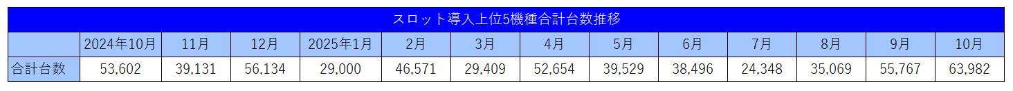まずは直近1年間における月間導入台数上位5機種の合計台数は下表の通り。