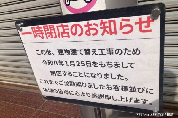 神奈川県川崎市幸区のパチンコホール『三益球殿川崎塚越店』が、建物の建て替え工事にともない、2026年1月25日(日)の営業をもって閉店した。