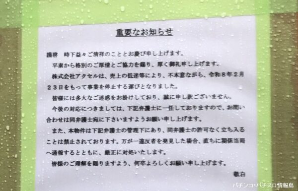 読者から「営業していない」と情報提供が寄せられたことを受け、現地を視察したところ、すでに閉店していることを確認。店頭には「運営会社である㈱アクセルは売り上げの低迷等により、2月23日をもって事業を停止する運びとなりました」との張り紙が掲示されていた。