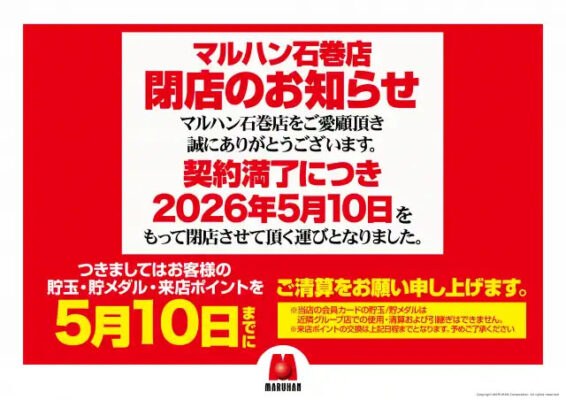 宮城県石巻市のパチンコホール『マルハン石巻店』が、契約満了にともない2026年5月10日(日)の営業をもって閉店することが告知された。