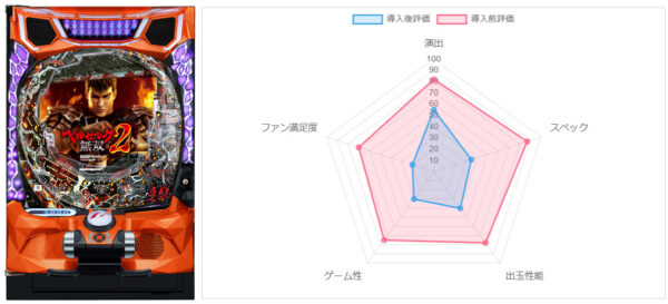 導入後に導入前の評価を上回って、導入前5位から1位に大幅ジャンプアップ。超ハイリスク・ハイリターンな仕様だが、LT性能だけでなく「当て勝つ革命」など手に汗握る展開が面白いと評価。作り込みについては原作ファンからの評価は高いものの、その荒さから評価は真っ二つに分かれぎみ。1位だが、幅広い層にウケるというよりは、原作が大好きで「大勝ちか大負けか」という極端な勝負を楽しめる人向けの台と言えるか。「当てさえすれば勝つんです!」をぜひホールで体感したい。