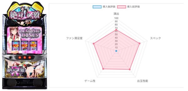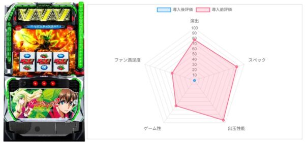 ※「AIレビュー」とは、その機種におけるネット上の評価・コメントを拾い集めて点数化したもの。ポジティブな声が多ければ点数は高くなり、逆にネガティブな声が多ければ低くなる傾向になっています。あくまでも忖度無しのユーザーの声が点数に反映されますから、「点数が高い=ユーザーの評判が良い」「点数が低い=ユーザーの評判が悪い」と思ってください。「演出」「スペック」「出玉性能」「ゲーム性」「ファン満足度」の各5項目100点満点で採点し、最終的に総合点も100点満点で採点しています。