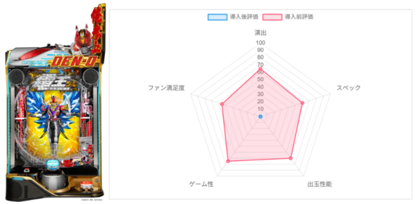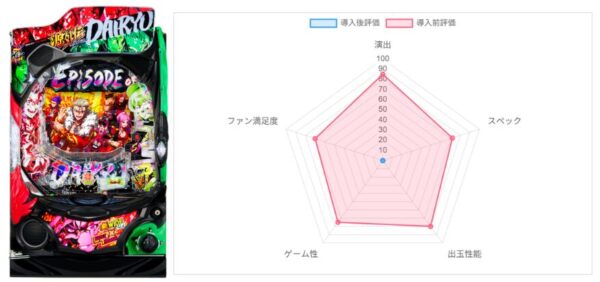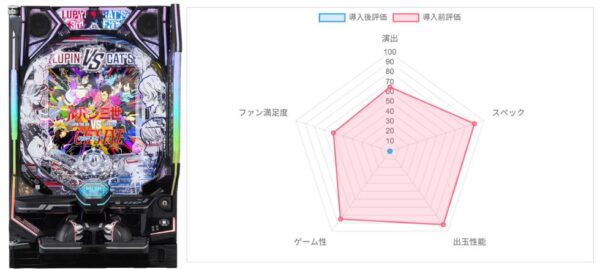 ※「AIレビュー」とは、その機種におけるネット上の評価・コメントを拾い集めて点数化したもの。ポジティブな声が多ければ点数は高くなり、逆にネガティブな声が多ければ低くなる傾向になっています。あくまでも忖度無しのユーザーの声が点数に反映されますから、「点数が高い=ユーザーの評判が良い」「点数が低い=ユーザーの評判が悪い」と思ってください。「演出」「スペック」「出玉性能」「ゲーム性」「ファン満足度」の各5項目100点満点で採点し、最終的に総合点も100点満点で採点しています。