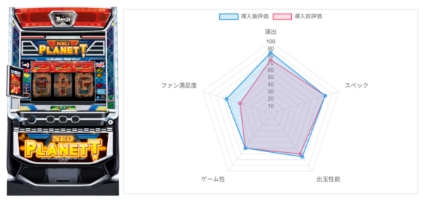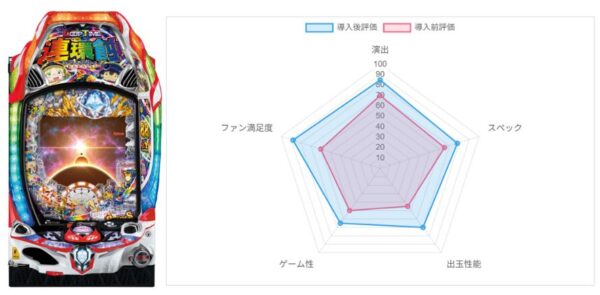 導入前に比べ点数を大幅に伸ばしている。軽い初当りでライトユーザー向けなのと、「演出」と「ファン満足度」の高さを見て分かるように、コンテンツファンからの評価が高いようだ。ただRUSH中に関しては、頻繁な転落煽りでストレスが溜まるのと、LT突入の遠さで評価は分かれている。LT突入率4%の低さはまさにLTと呼ぶべき突入率だが、突入率が低い上に出玉もLT依存であれば、ヤレた人以外からのリピートは少なそう。
