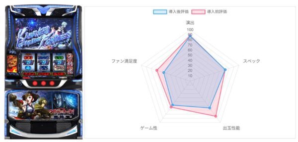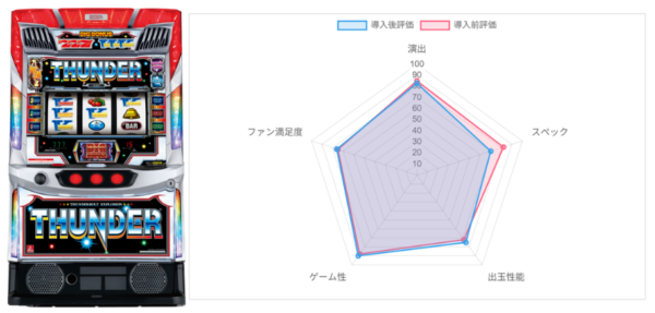 「カバネリ2」は導入前より多少点数は落としたが、ST中の面白さは健在と一定以上の評価はされている。ただ、投資スピードの速さと低設定の過酷さが大きな懸念点とされており、比較的マイルドさが好きだったユーザーが付いてこられるか今後の稼働に注目したい。「サンダー」は導入前と導入後で総合点は変わっておらず、アクロス系を好んで打つユーザーから受け入れられているならば、今後も安定した稼働に期待できそうか。
