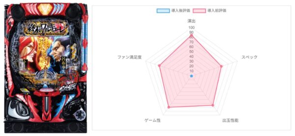 演出面では原作の緊張感が高く評価されていますが、スペックの門の狭さがファン満足度の足を引っ張る形です。総じて、万人に受ける台ではないものの、一撃の「ヒリつき」を求めるコアな層を虜にする、極めて挑戦的な一台と言えます。