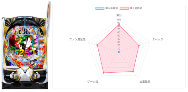 ※「AIレビュー」とは、その機種におけるネット上の評価・コメントを拾い集めて点数化したもの。ポジティブな声が多ければ点数は高くなり、逆にネガティブな声が多ければ低くなる傾向になっています。あくまでも忖度無しのユーザーの声が点数に反映されますから、「点数が高い=ユーザーの評判が良い」「点数が低い=ユーザーの評判が悪い」と思ってください。「演出」「スペック」「出玉性能」「ゲーム性」「ファン満足度」の各5項目100点満点で採点し、最終的に総合点も100点満点で採点しています。