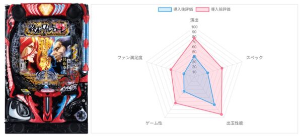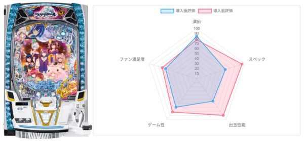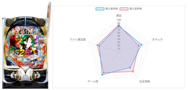 演出82点(85)・スペック74点(65)・出玉性能60点(75)・ゲーム性88点(80)・ファン満足度64点(70)