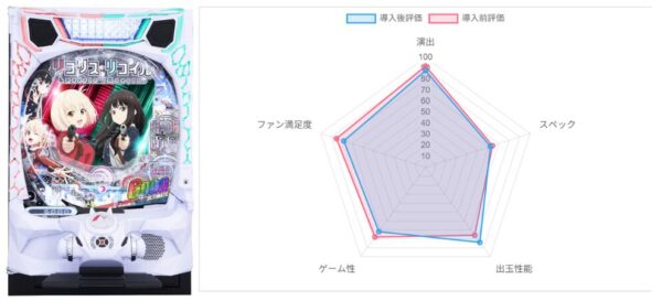 今回、コンテンツ力などから最も前評判が高く期待されていたであろう「eリコリス・リコイル」が1位となった。導入前より評価をほとんど落としておらず、ユーザーの期待通りのデキだったといえるか。他機種も「e転生したらスライムだった件2」「e 終末のワルキューレ」は導入後に大きく点数を落としたが、それなりの点数に落ち着いた機種が多かったといえる結果となった。