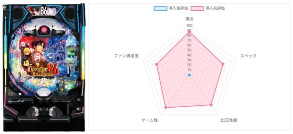 導入前評価では、アムテックスの「e86-エイティシックス-」が1位となった。斬新なゲーム性にスタートサポートが付いた設計で、ユーザーの遊技意欲を駆り立てているようだ。人気シリーズの最新作である「eリング 最恐領域」は3位に沈んだ。マンネリ化を打破すべく新規要素を多数追加したが、現状はあまり受け入れられていないユーザーが多いようだ。