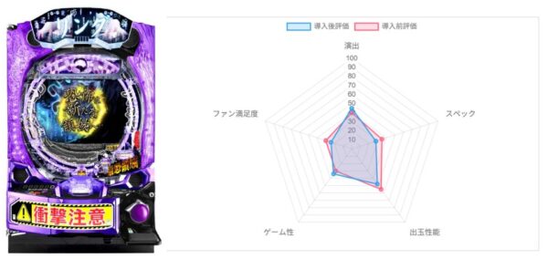 演出45点(40)・スペック28点(35)・出玉性能48点(55)・ゲーム性34点(30)・ファン満足度24点(30)