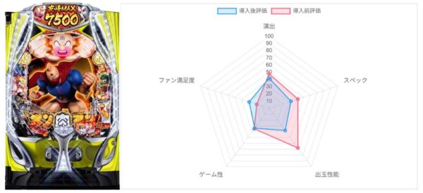 演出42点(48)・スペック32点(42)・出玉性能38点(68)・ゲーム性34点(35)・ファン満足度29点(18)