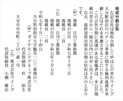 大分県大分市にて営業中のパチンコホール『ウイング大分駅前店』がダイヤモンドグループ㈱に事業承継されることが10月24日の官報に公告された。