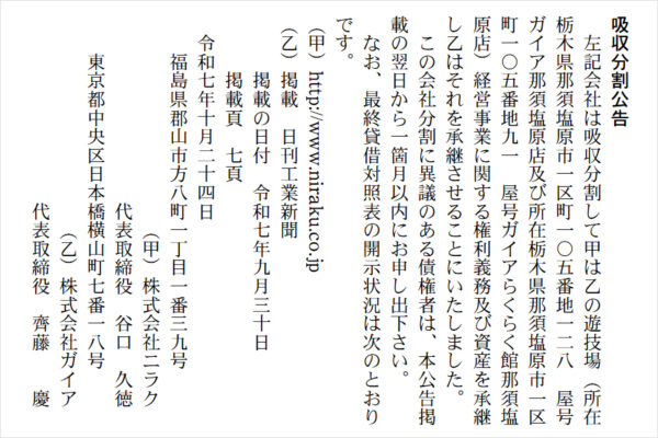 10月24日付の官報にて、㈱ニラクが栃木県那須塩原市に所在するパチンコホール『ガイア那須塩原店』および『ガイアらくらく館那須塩原店』の2店舗を事業承継することが公告された。