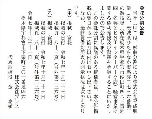 栃木県宇都宮市にて営業中の『ZENTインターパーク店』が、㈱ブレスに事業承継されることが10月31日の官報に公告された。