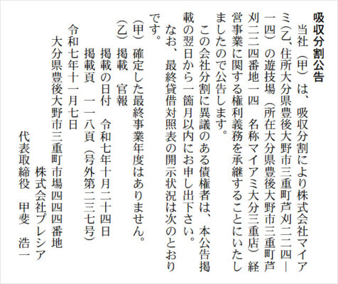 大分県豊後大野市のパチンコホール『マイアミ大分三重店』が㈱プレシアに事業承継されることが11月7日の官報に公告されている。