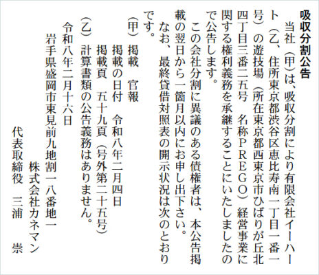 東京都西東京市のパチンコホール『プレゴひばりが丘店』が㈱カネマン(本社・岩手県盛岡市)に事業承継されることが、2月16日の官報に公告された。