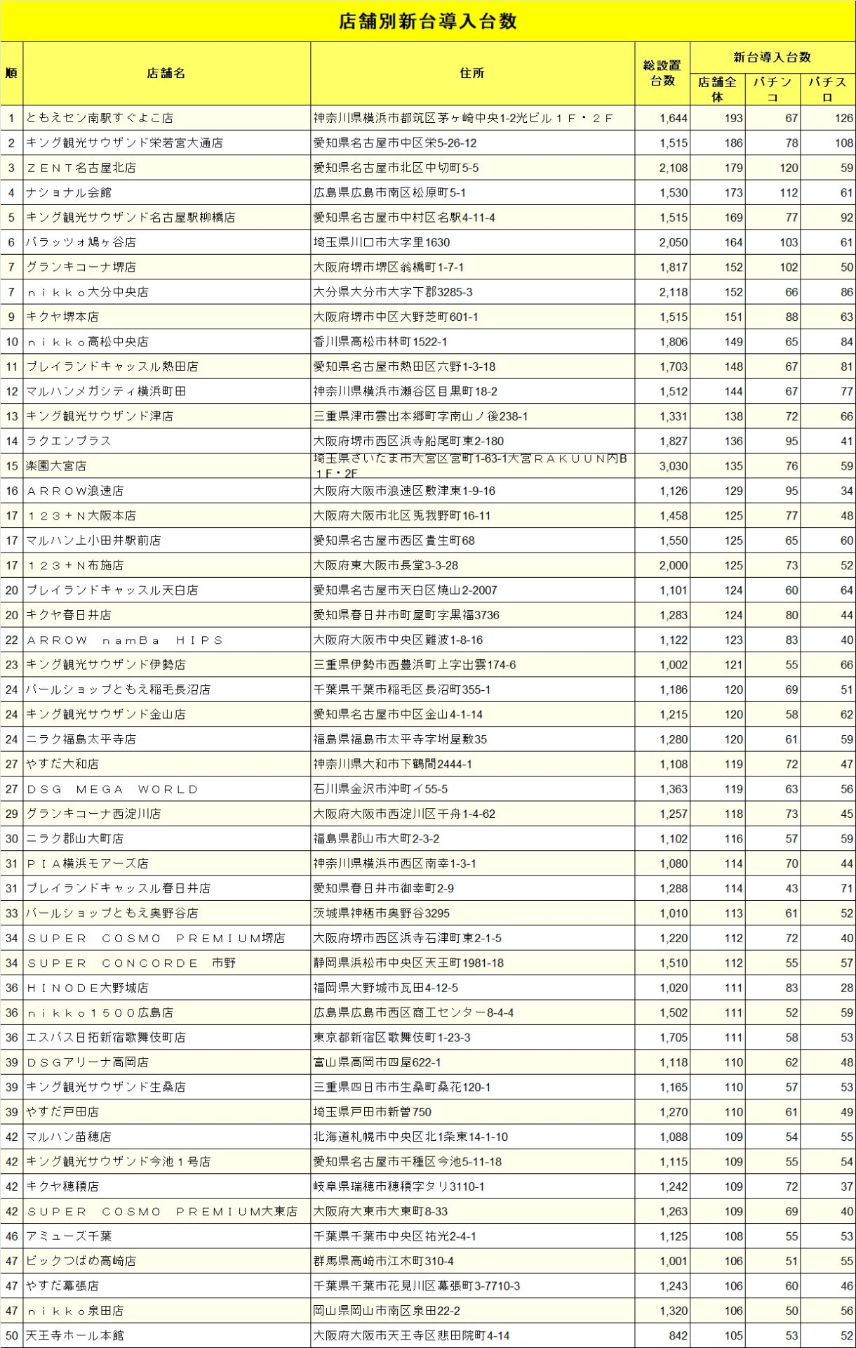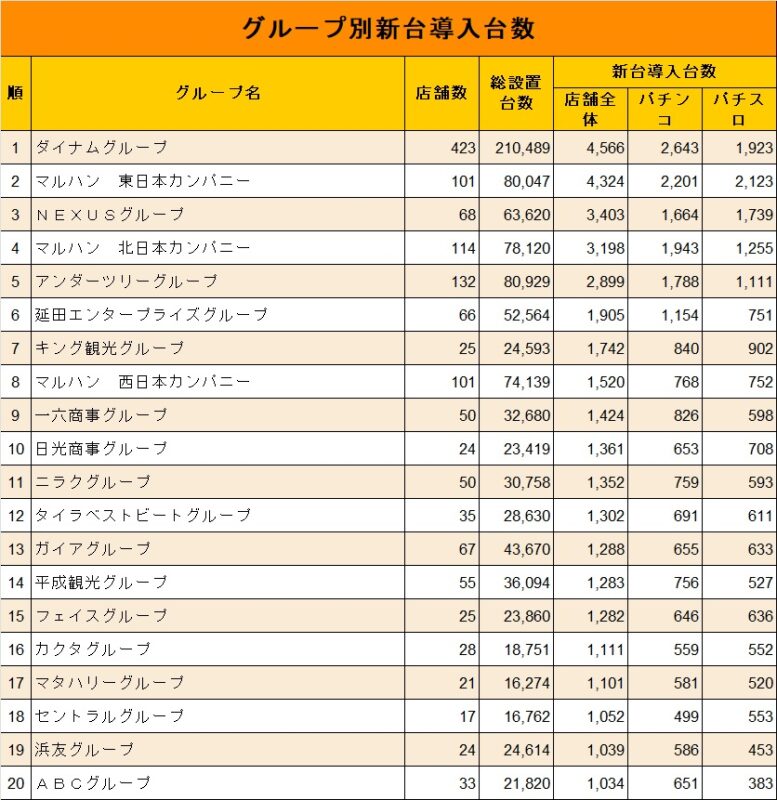 情報島+ HOME > 店舗・グループ別新台導入台数ランキング 店舗別新台導入台数 グループ別新台導入台数 ※2025年11月26日週データで集計 月間導入台数上位50店舗を掲載 ※上記以外全店のデータの閲覧を希望される場合はお問い合わせフォームよりご連絡ください ※2025年11月26日週データで集計 月間導入台数上位20グループを掲載 ※上記以外全店のデータの閲覧を希望される場合はお問い合わせフォームよりご連絡ください 「新台」とは 発売から4週以内に導入されたもののみとし、それ以降に導入されたものについては新台としてカウントしない 2025年3月1日 author