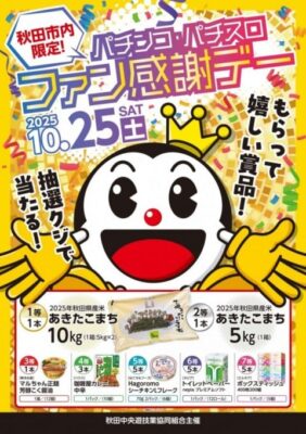 秋田市内のパチンコ店・パチスロ店が加盟する秋田中央遊技業協同組合はこのほど、2025年10月25日(土)に「秋田市内限定!パチンコ・パチスロファン感謝デー」を開催する。