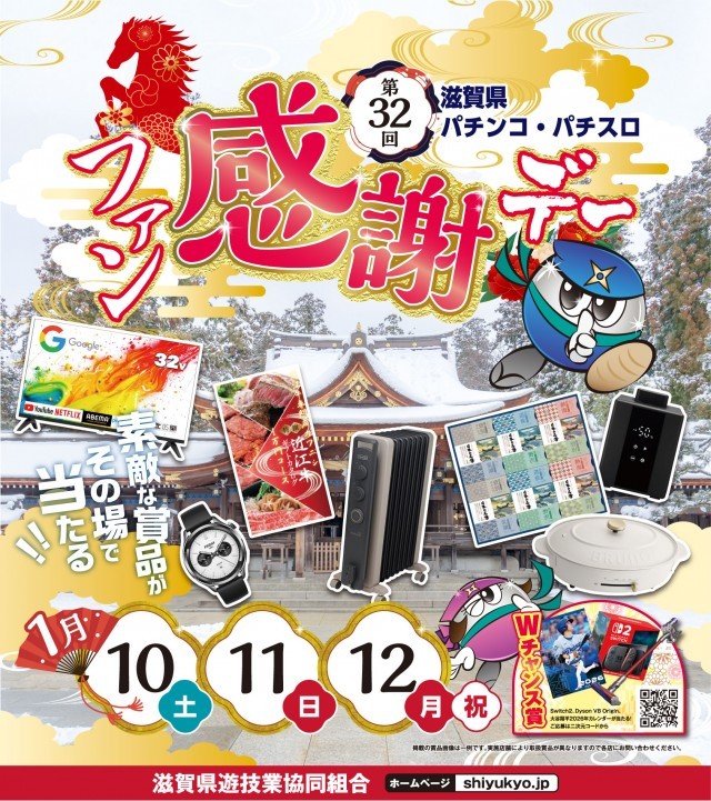 滋賀県のパチンコ店・パチスロ店が加盟する滋賀県遊技業協同組合はこのほど、2026年1月10日(土)から1月12日(月・祝)までの3日間、組合加盟店舗において「第32回滋賀県パチンコ・パチスロファン感謝デー」を開催する。