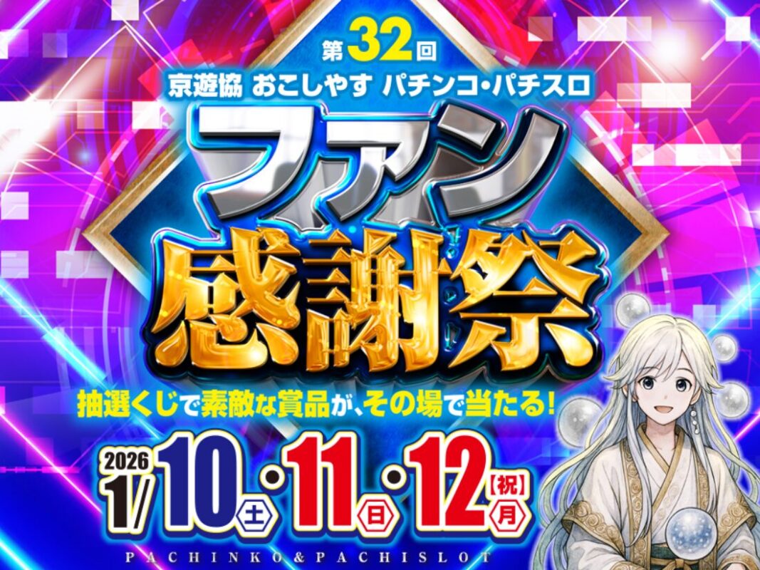 京都府遊技業協同組合(京遊協)は2026年1月10日(土)から1月12日(月・祝)までの3日間、組合加盟店舗において「第32回 京遊協 おこしやす パチンコ・パチスロファン感謝祭」を開催する。