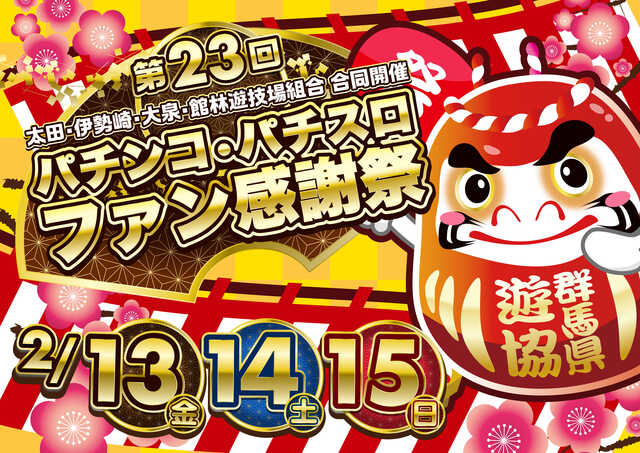 群馬県遊技業協同組合の地区組合である太田遊技場組合、伊勢崎遊技場組合、大泉遊技場組合、館林遊技場組合の4組合は、2026年2月13日(金)から2月15日(日)までの3日間、各地区の加盟店舗において「第23回パチンコ・パチスロファン感謝祭」を合同開催する。