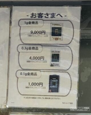 金地金価格の高騰に伴い東京都内のパチンコ店は、本日4月20日より金地金賞品の「0.3g金賞品」(中景品)を値上げした。「中景品」の値上げは先月10日に続き今年2回目。