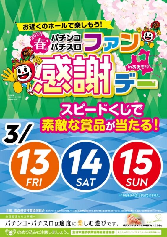 青森県遊協、3月13日より「2026春のパチンコ・パチスロファン感謝デーinあおもり」を開催