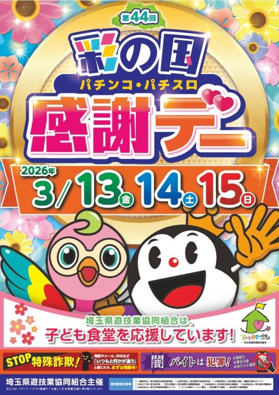 埼玉県のパチンコ・パチスロ店が加盟する埼玉県遊技業協同組合は、2026年3月13日(金)から3月15日(日)までの3日間、組合加盟店舗において「第44回彩の国パチンコ・パチスロファン感謝デー」を開催する。