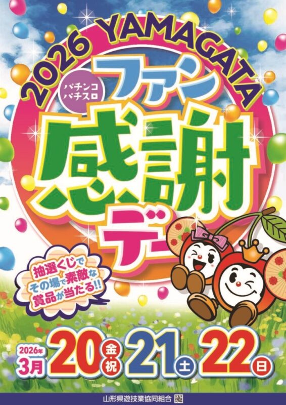山形県のパチンコ店・パチスロ店が加盟する山形県遊技業協同組合は、2026年3月20日(金・祝)から3月22日(日)までの3日間、組合加盟店舗において「2026 YAMAGATA パチンコ・パチスロファン感謝デー」を開催する。