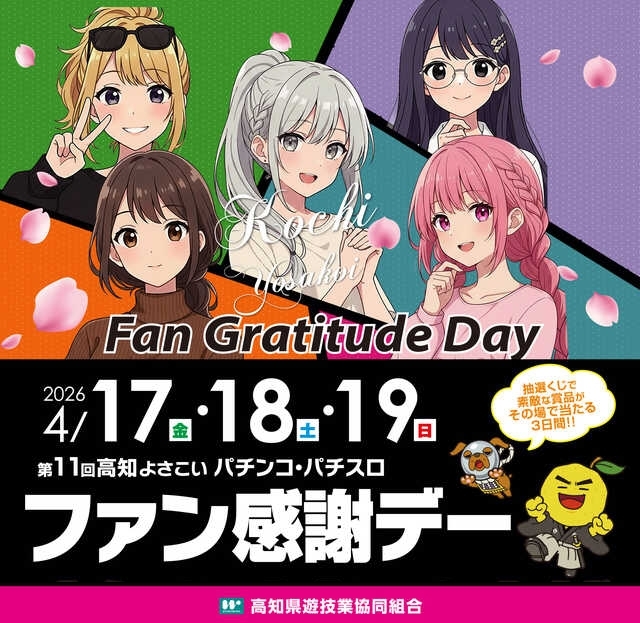 高知県内のパチンコ店・パチスロ店が加盟する高知県遊技業協同組合は、2026年4月17日(金)から4月19日(日)までの3日間、組合加盟店舗において「第11回高知よさこいパチンコ・パチスロファン感謝デー」を開催する。
