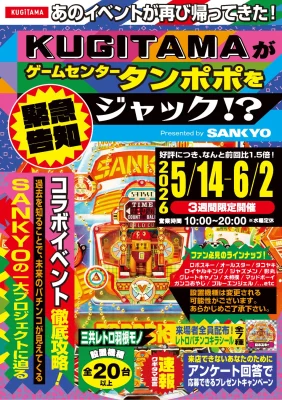 SANKYOは、東京都福生市のゲームセンター「ゲームセンタータンポポ」とのコラボイベント『KUGITAMAがゲームセンタータンポポをジャック!? Presented by SANKYO』を、2026年5月14日から6月2日までの期間で開催する。