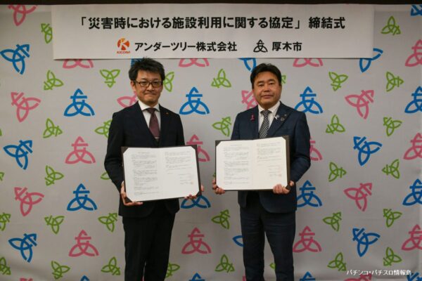 『キコーナ』などの屋号でパチンコホールをチェーン展開するアンダーツリー(本社・大阪市西区)はこのほど、厚木市との間で災害時における施設利用に関する協定を締結した。