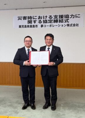 夢コーポレーション(本社・愛知県豊橋市)は4月21日、鹿児島県霧島市と「災害時における支援協力に関する協定」を締結した。