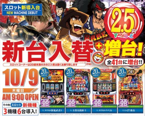 スロット各台計数機導入、パチンコ貯玉再プレイシステム無制限導入、46枚スロット貯メダル再プレイ(460枚→920枚)