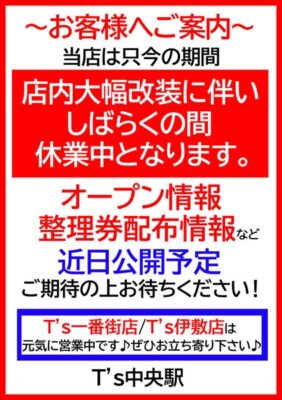 鹿児島県鹿児島市のパチンコ店『T's 中央駅』が店内大幅改装のため、2025年10月19日(日)より休業している。