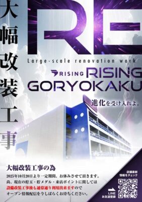 【ホール情報】ベガスベガスへ屋号変更か?北海道函館市のパチンコ店『ライジング函館五稜郭』が改装工事のため10月20日より休業に入る