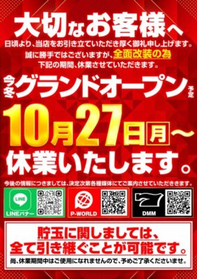 大阪府門真市のパチンコ店『TEXAS 門真』が全面改装のため、2025年10月27日(月)より休業に入る。