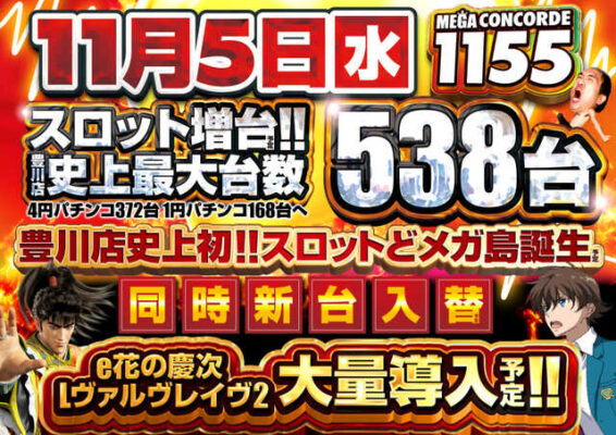 愛知県豊川市で営業するパチンコホール『MEGAコンコルド1155豊川インター店』は、2025年11月5日(水)にスロットコーナーを増台する。