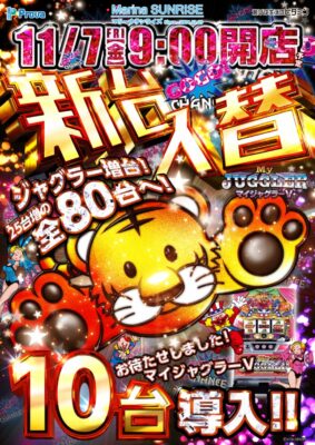 今回のリニューアルオープンにより、スロットコーナーを240台から280台ヘスケールアップ。また、当日は新台入替が予定されており、人気機種「マイジャグラーV」(10台)を含めた「ジャグラー」シリーズの増台がホームページ上で告知されている。