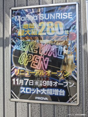 広島県安芸郡で営業するパチンコホール『マリーナサンライズ』はこのほど、2025年11月7日(金)にリニューアルオープンを実施すると発表した。
