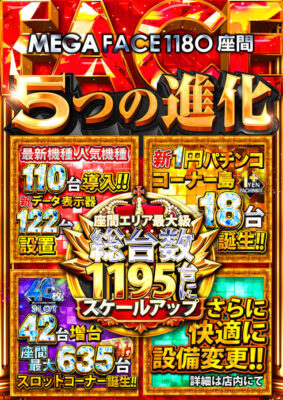 そんな中『メガフェイス1180座間』では、スロットコーナーを592台から635台へと増台。総設置台数は1176台から1195台へと大きくスケールアップする。