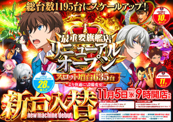 当日は、注目機種「Lパチスロ革命機ヴァルヴレイヴ2」(28台導入)や「e花の慶次~黄金の一撃」(10台導入)、「eFもののがたり」(11台導入)など、大型新台入替も合わせて予定されている。