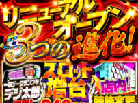 また、スロットコーナーに関しては、各台計数機の設置や大型液晶モニターを搭載したデータランプ「ビグモエクセル」、データ表示機「デジ太郎」など様々な最新設備が導入される。