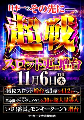 1000円46枚スロット増台(221台→255台)、大型モニター設置