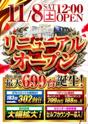 その同店が、設置台数を542台から699台へと大幅に増台し、明日2025年11月8日(土)の12時にリニューアルオープンする。なお、リニューアルの内容は以下の通り。