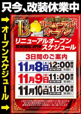 【ホール情報】大幅増台!鹿児島県鹿児島市のパチンコ店『T's 中央駅』が明日11月8日リニューアルオープン