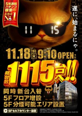 北海道札幌市中央区で営業するパチンコホール『タワーひまわり』は、2025年11月18日(火)に増床オープンを実施する。