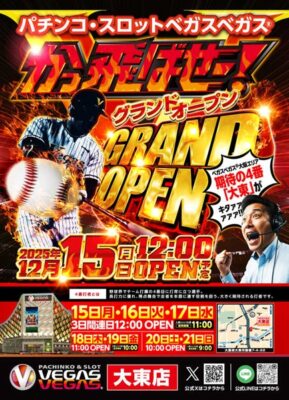 【グランドオープン】大阪府大東市にてパチンコ店『ベガスベガス大東店』がいよいよ12月15日新規オープン
