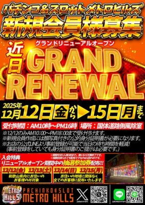 和歌山県和歌山市のパチンコ店『メトロ ヒルズ』がリニューアル準備のため、2025年11月4日(火)より休業しているのは既報の通りである。